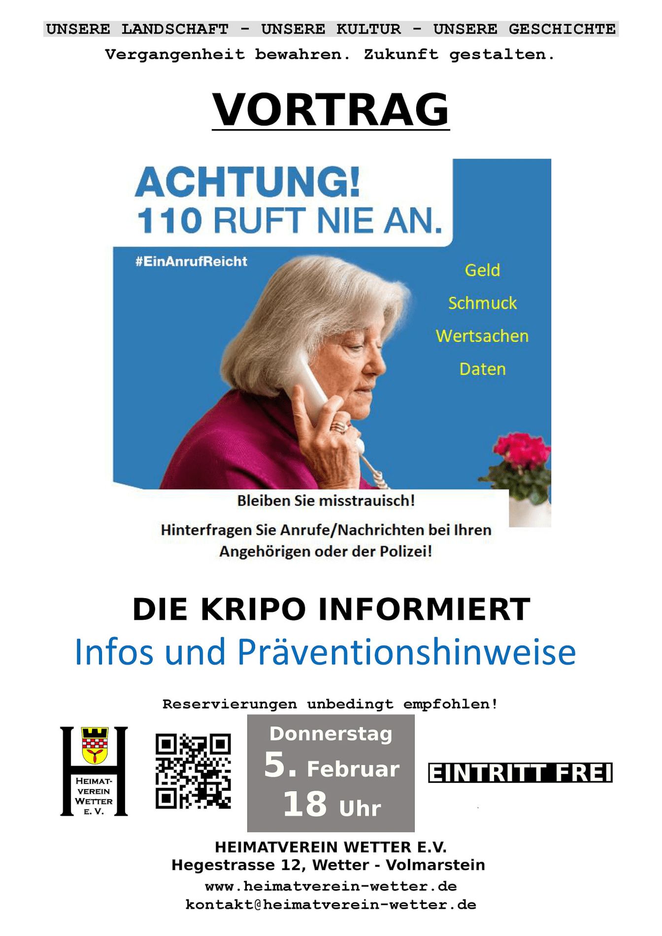 Am 5. Februar 2026 fand in der Heimatstube ein interessanter Vortrag statt. Es ging um Kriminalität an Senioren. Das ging weit über den Enkeltrick hinaus. Vortragende waren 2 Seniorenbeauftragte der Stadt Wetter in Zusammenarbeit mit der Kripo. Frau Blomberg und Herr Wackrow bereiteten das Thema überaus spannend auf und ließen uns auch von unseren Erfahrungen berichten. Die Zeit verging wie im Fluge. Deshalb ist eine weitere Veranstaltung mit anderen Themen für die 2. Jahreshälfte 2026 geplant. Unser Dank geht an Frau Blomberg und Herrn Wackrow.